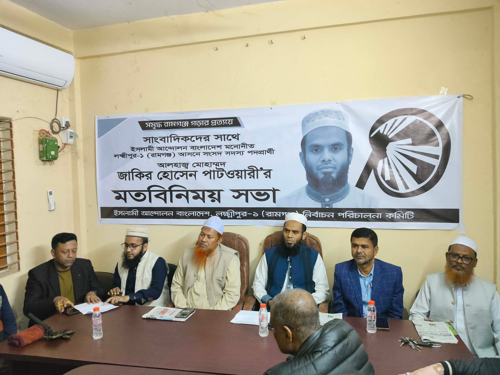 লক্ষ্মীপুর- ১ (রামগঞ্জ) আসনে ইসলামী আন্দোলন বাংলাদেশের হাতপাখা প্রতীকের প্রার্থী আলহাজ্ব জাকির হোসেন পাটোয়ারীর সাথে রামগঞ্জ প্রেসক্লাবের সাংবাদিকদের মতবিনিময় সভা অনুষ্ঠিত হয়েছে।